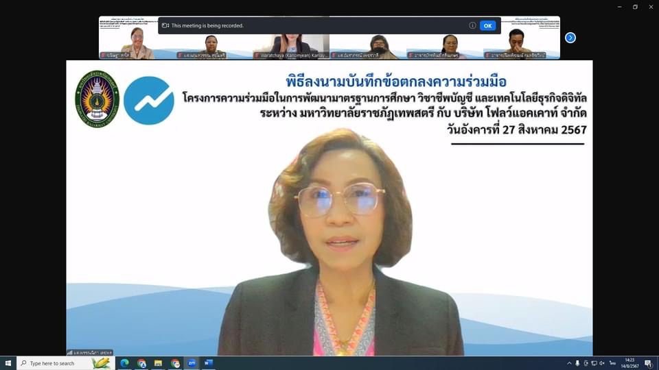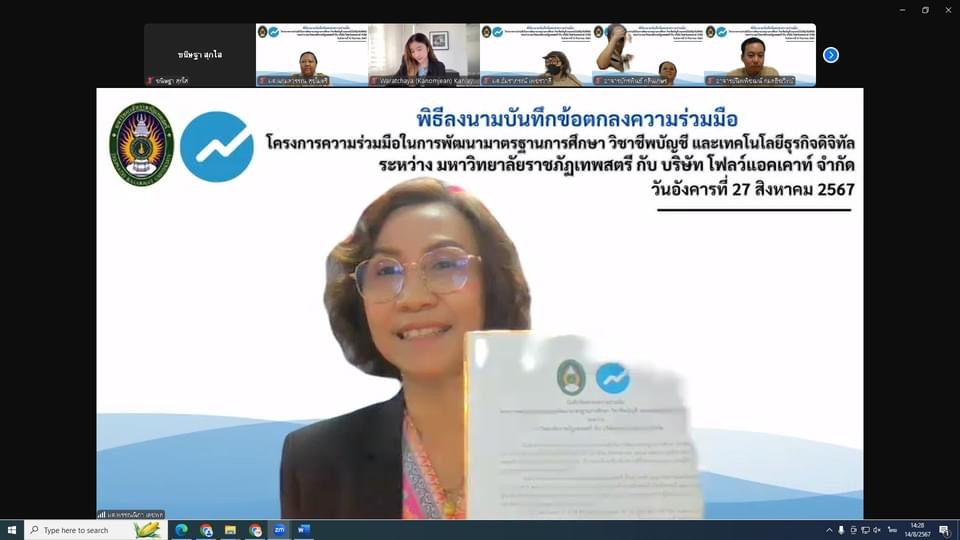 วันที่ 27 สิงหาคม 2567 พร้อมด้วยรองคณบดีฝ่ายบริหาร หัวหน้าสาขาวิชาการบัญชี อาจารย์ผู้รับผิดชอบหลักสูตร และบุคลากร โดยมีสาระสำคัญเพื่อพัฒนานักศึกษาของมหาวิทยาลัยให้ได้มาตรฐาน สอดคล้องกับความต้องการของผู้ประกอบการและตลาดการจ้างงาน ส่งเสริมและพัฒนาคณาจารย์และนักศึกษา ให้มีความรู้และความเชี่ยวชาญในการใช้โปรแกรมโฟลว์แอคเคาท์สามารถนำไปใช้งานได้อย่างถูกต้อง และพัฒนาหลักสูตรการอบรมเกี่ยวกับโปรแกรมโฟลว์แอคเคาท์ร่วมกัน เพื่อช่วยยกระดับมาตรฐานวิชาชีพและขยายความรู้ไปยังผู้สนใจภายนอกมหาวิทยาลัย อันจะพัฒนาคุณภาพนักศึกษาของมหาวิทยาลัย ให้เกิดประโยชน์สูงสุดต่อวิชาชีพ ผ่านสื่ออิเล็กทรอนิกส์ ระบบ Zoom meeting ณ ห้องช่อยูงทอง ชั้น 2 อาคาร 22 คณะวิทยาการจัดการ มหาวิทยาลัยราชภัฏเทพสตรี