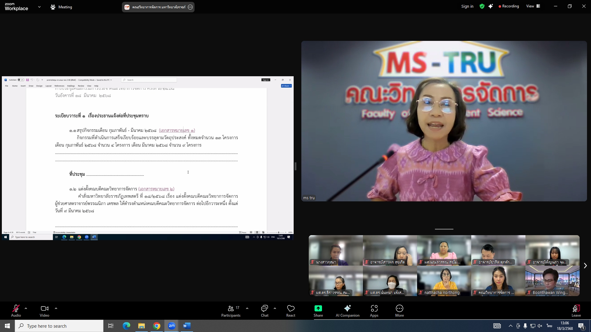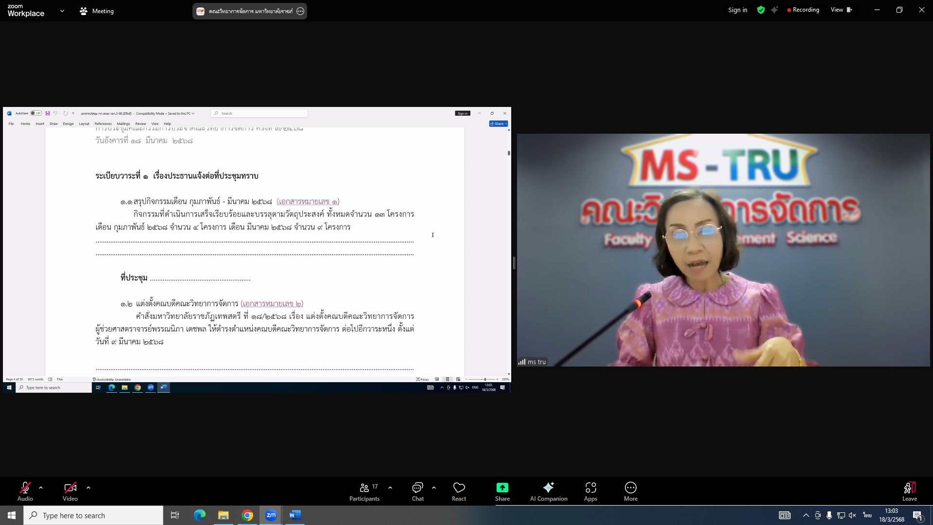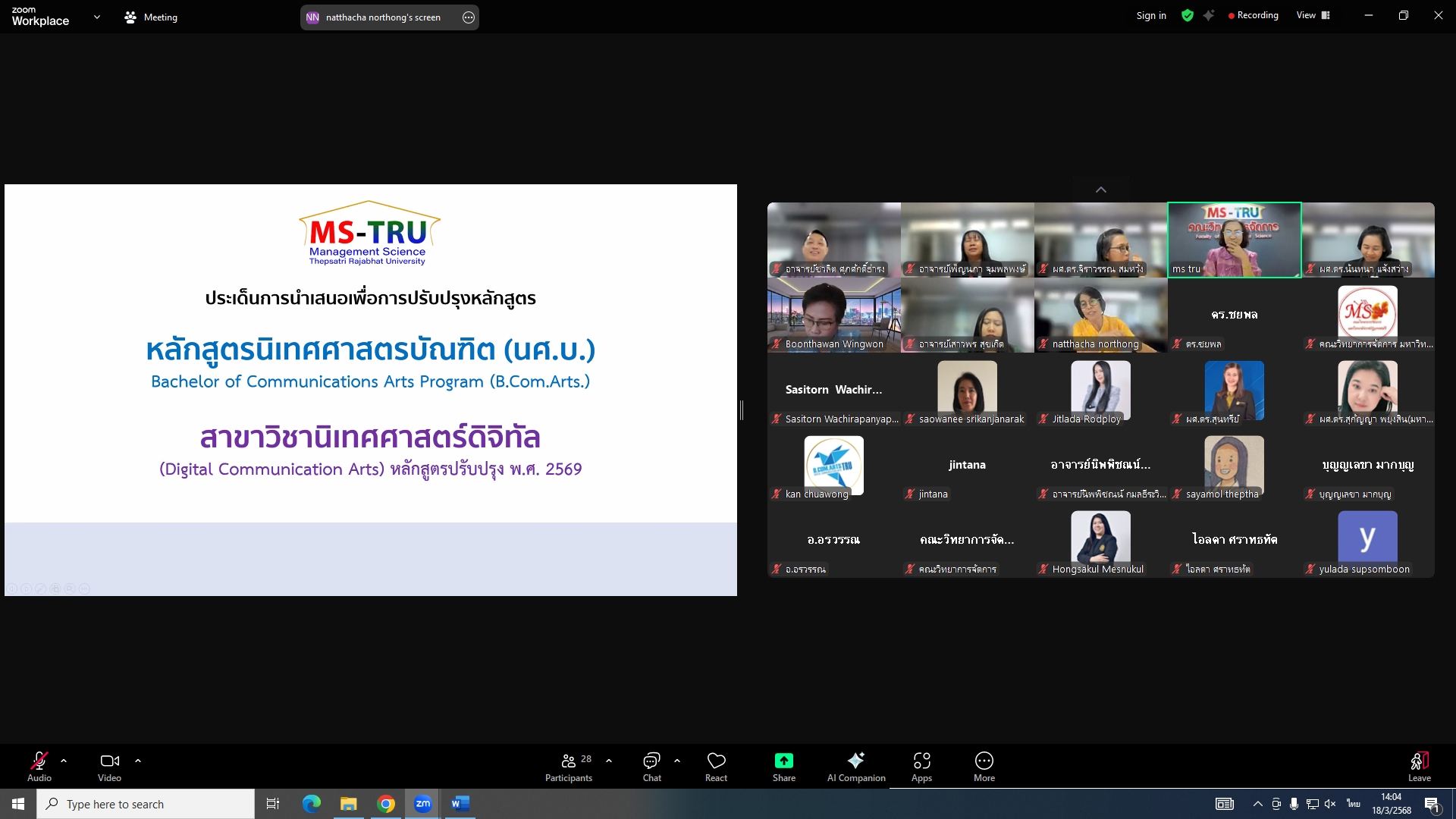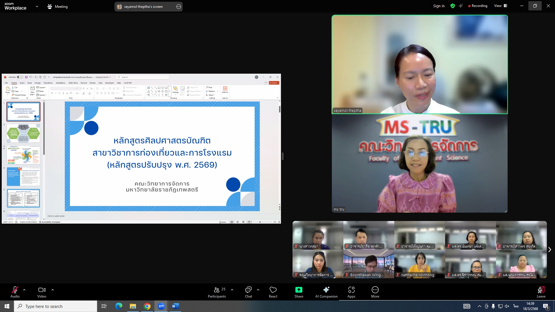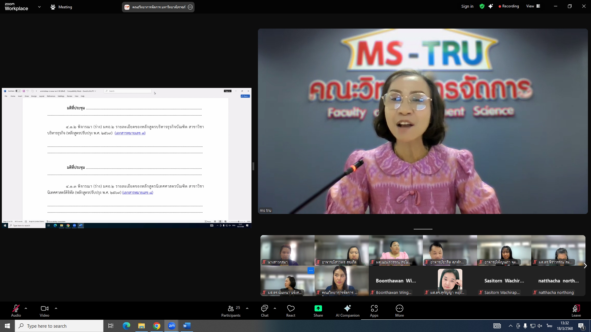 วันที่ 18 มีนาคม 2568 ผศ.พรรณนิภา เดชพล คณบดีคณะวิทยาการจัดการ เป็นประธานการประชุมคณะกรรมการประจำคณะวิทยาการจัดการ ครั้งที่ 3/2568 ในรูปแบบการประชุมระบบ Hybrid Meeting ณ ห้องช่อยูงทอง ชั้น 2 อาคาร 22 คณะวิทยาการจัดการ ซึ่งมีคณะกรรมการเข้าร่วมการประชุมกว่า 2 ใน 3 ซึ่งมีคณะกรรมการเข้าร่วมการประชุมกว่า 2 ใน 3 โดยมีวาระสำคัญที่ร่วมกันพิจารณา ได้แก่ พิจารณาผลการประเมินผลการสอนล่วงหน้า เพื่อขอกำหนดตำแหน่งทางวิชาการ (วาระลับ)/พิจารณา (ร่าง) มคอ.2 รายละเอียดของหลักสูตรบริหารธุรกิจบัณฑิต สาขาวิชาบริหารธุรกิจ (หลักสูตรปรับปรุง พ.ศ. 2569)/พิจารณา (ร่าง) มคอ.2 รายละเอียดของหลักสูตรนิเทศศาสตรบัณฑิต สาขาวิชานิเทศศาสตร์ดิจิทัล (หลักสูตรปรับปรุง พ.ศ. 2569)