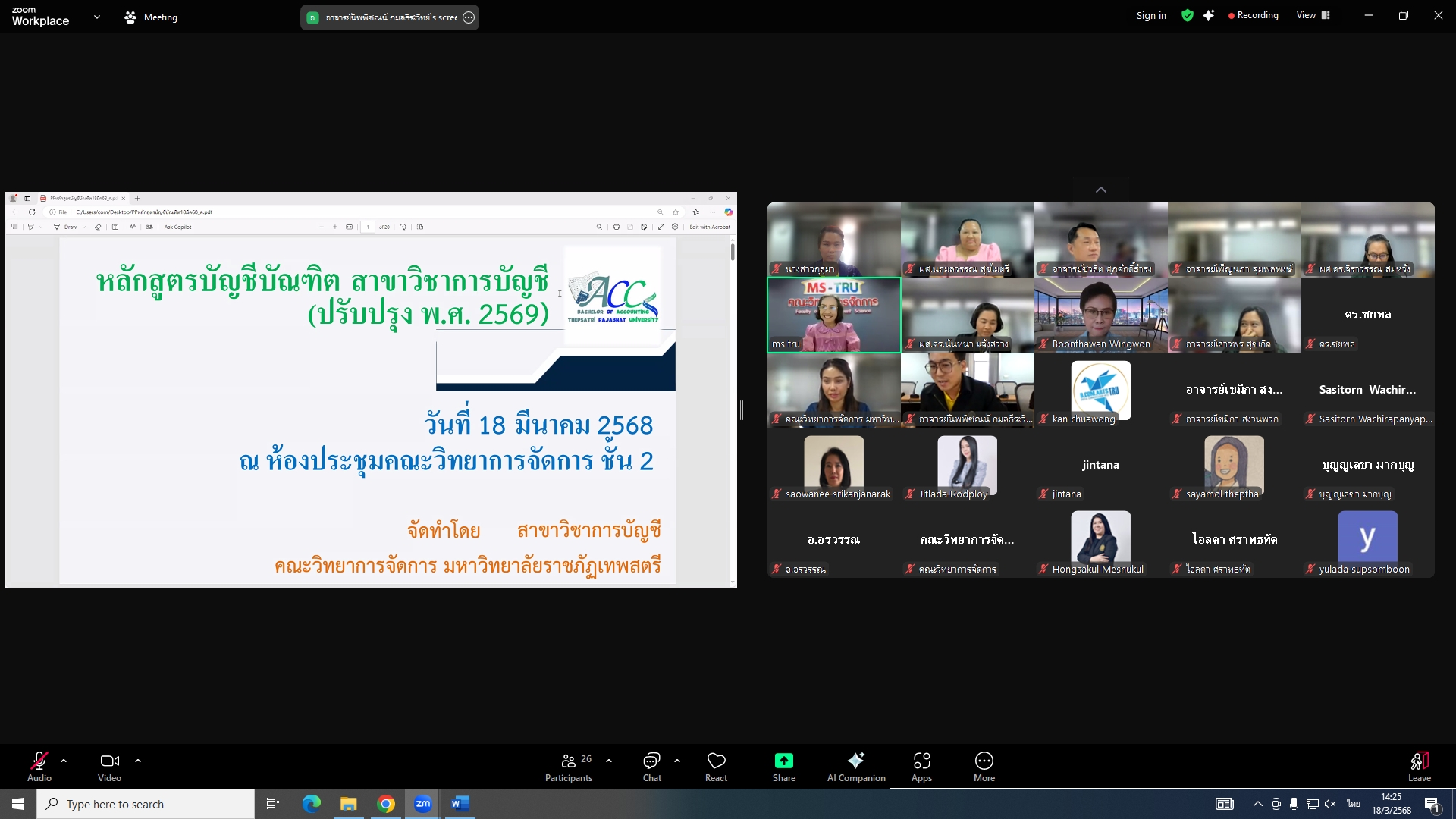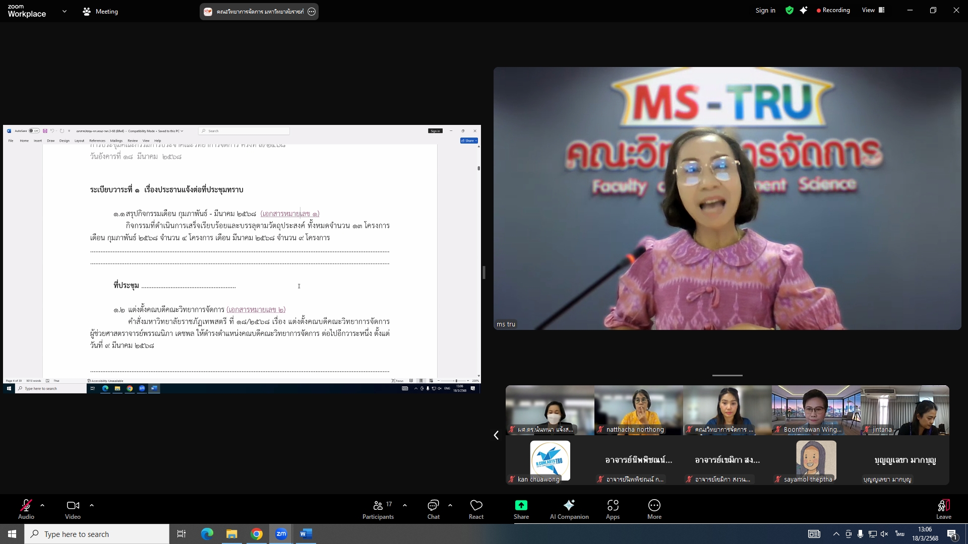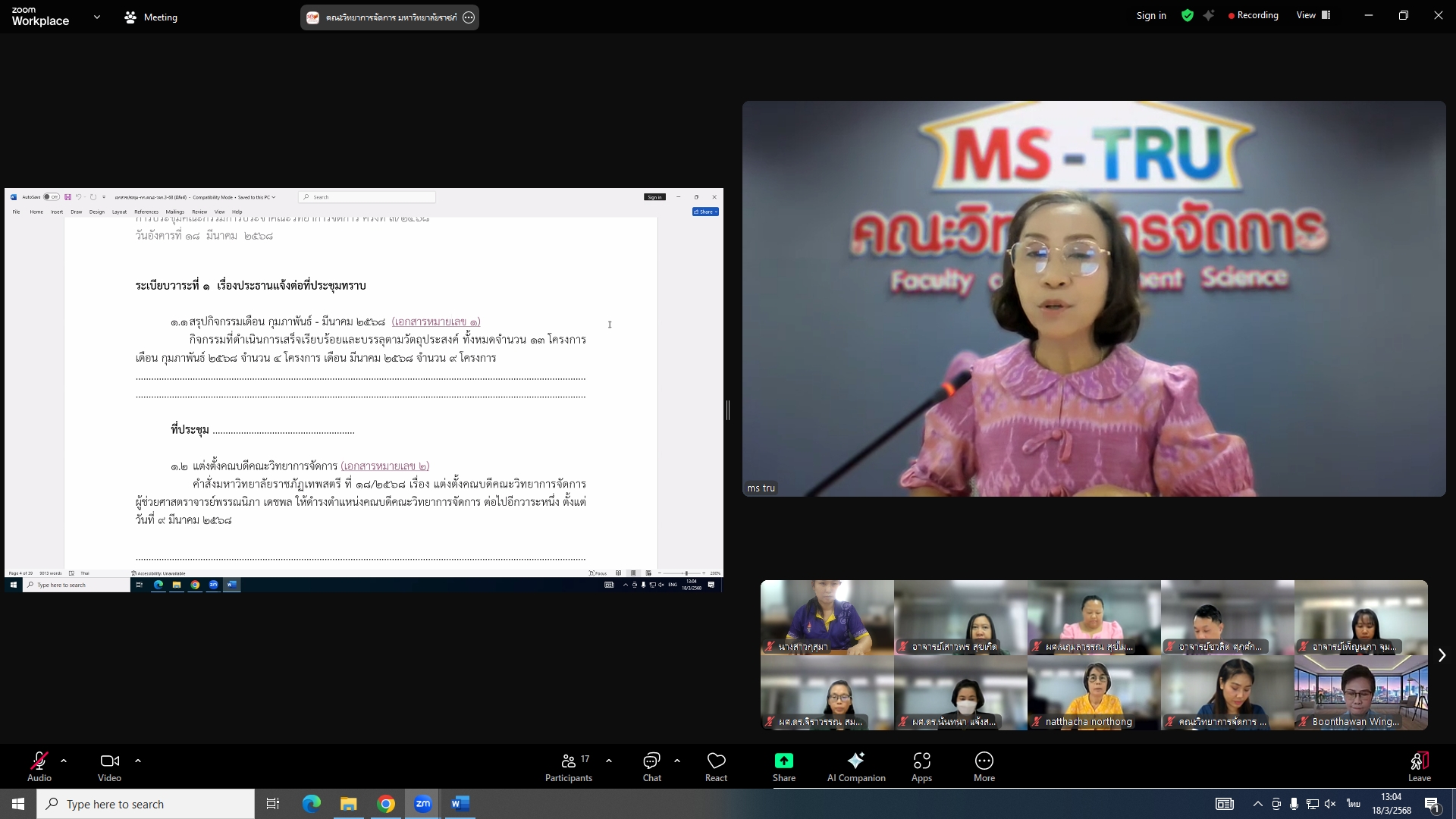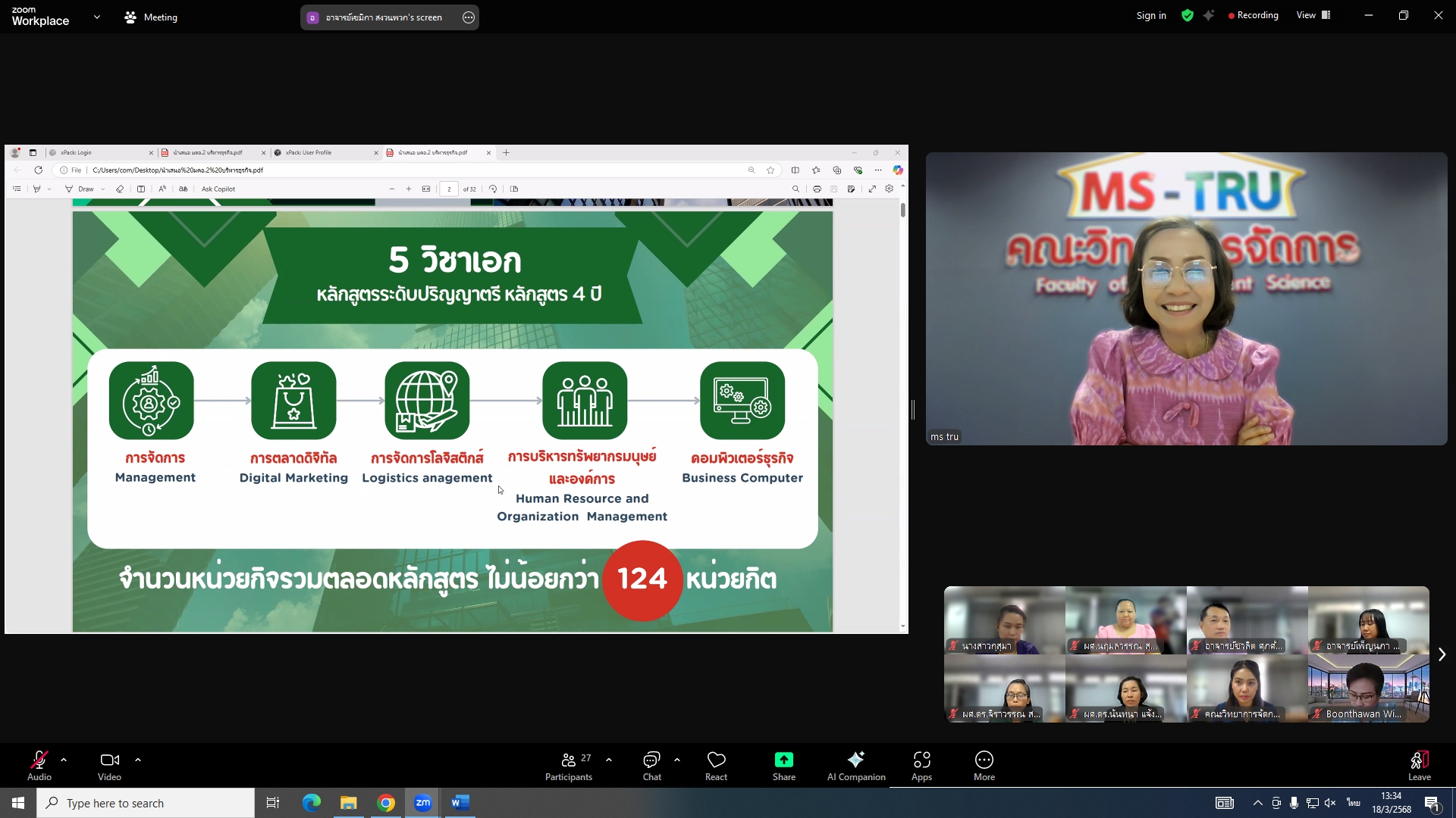 วันที่ 18 มีนาคม 2568 ผศ.พรรณนิภา เดชพล คณบดีคณะวิทยาการจัดการ เป็นประธานการประชุมคณะกรรมการประจำคณะวิทยาการจัดการ ครั้งที่ 3/2568 ในรูปแบบการประชุมระบบ Hybrid Meeting ณ ห้องช่อยูงทอง ชั้น 2 อาคาร 22 คณะวิทยาการจัดการ ซึ่งมีคณะกรรมการเข้าร่วมการประชุมกว่า 2 ใน 3 ซึ่งมีคณะกรรมการเข้าร่วมการประชุมกว่า 2 ใน 3 โดยมีวาระสำคัญที่ร่วมกันพิจารณา ได้แก่ พิจารณาผลการประเมินผลการสอนล่วงหน้า เพื่อขอกำหนดตำแหน่งทางวิชาการ (วาระลับ)/พิจารณา (ร่าง) มคอ.2 รายละเอียดของหลักสูตรบริหารธุรกิจบัณฑิต สาขาวิชาบริหารธุรกิจ (หลักสูตรปรับปรุง พ.ศ. 2569)/พิจารณา (ร่าง) มคอ.2 รายละเอียดของหลักสูตรนิเทศศาสตรบัณฑิต สาขาวิชานิเทศศาสตร์ดิจิทัล (หลักสูตรปรับปรุง พ.ศ. 2569)