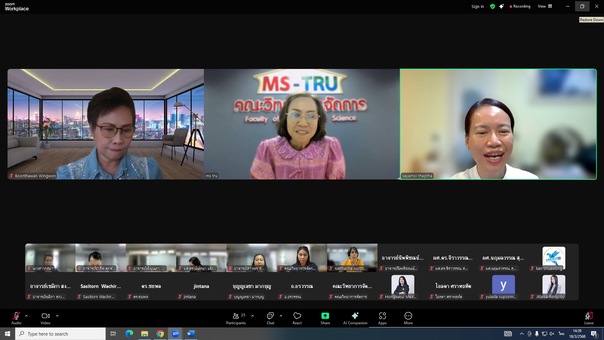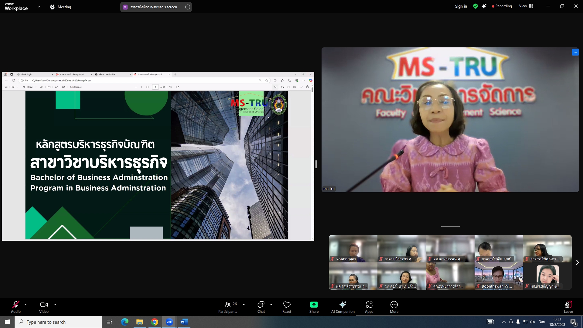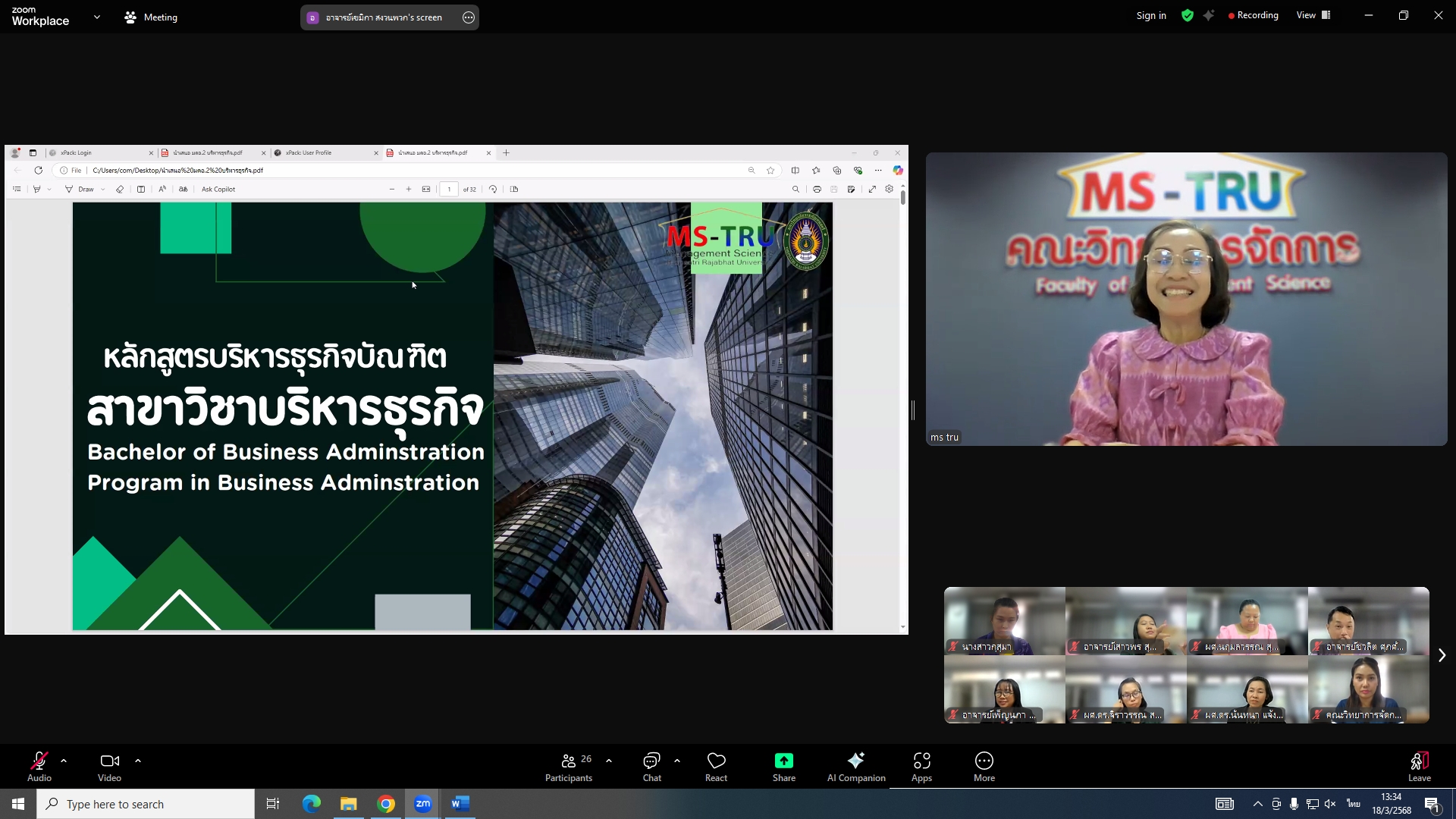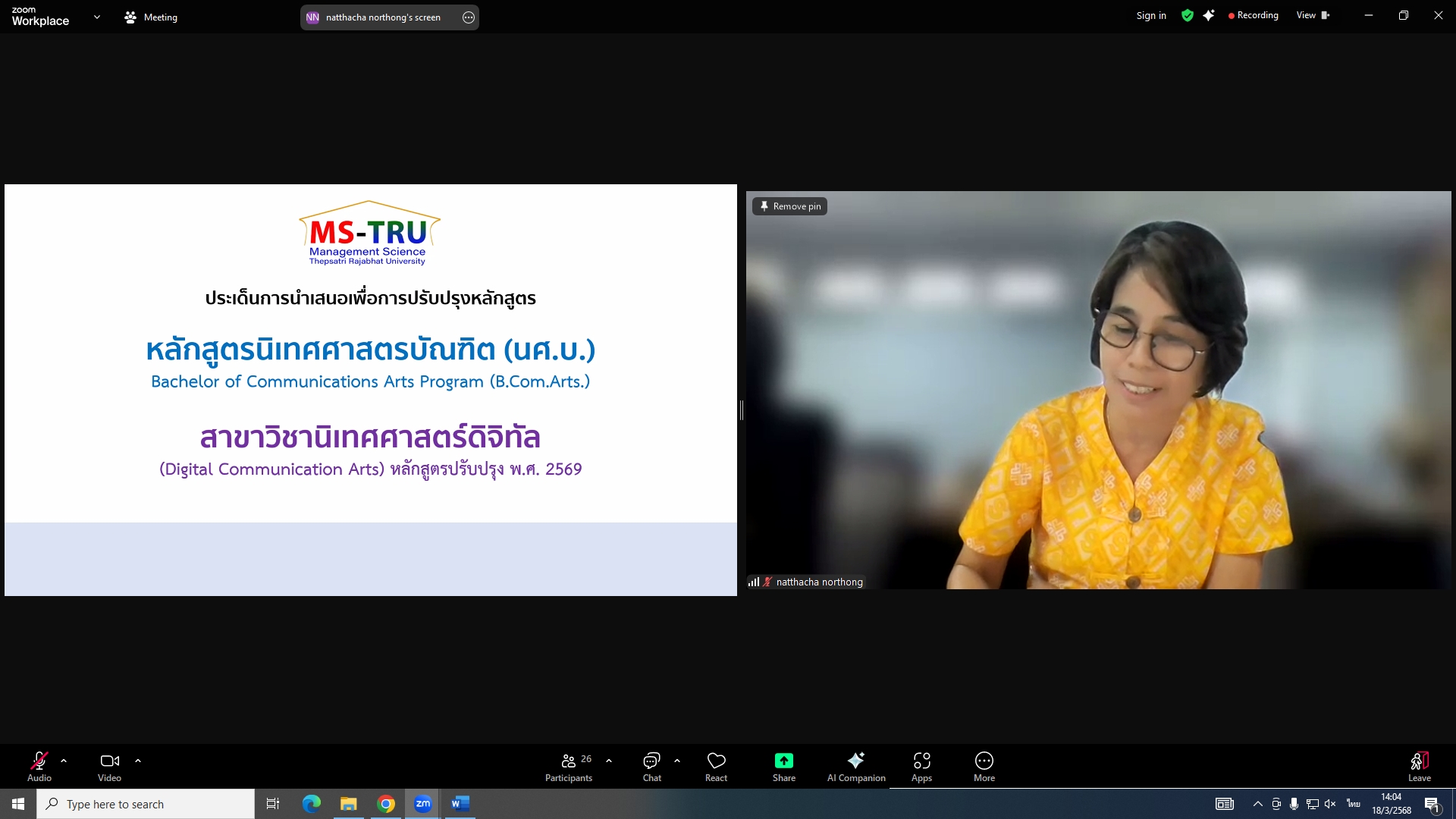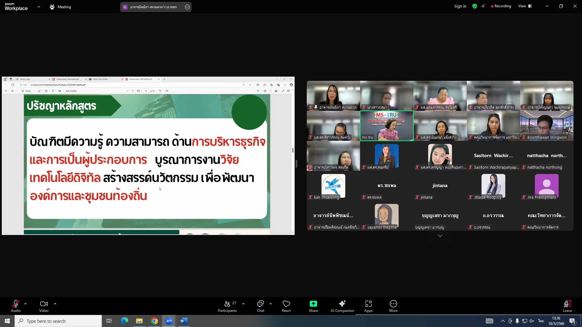 วันที่ 18 มีนาคม 2568 ผศ.พรรณนิภา เดชพล คณบดีคณะวิทยาการจัดการ เป็นประธานการประชุมคณะกรรมการประจำคณะวิทยาการจัดการ ครั้งที่ 3/2568 ในรูปแบบการประชุมระบบ Hybrid Meeting ณ ห้องช่อยูงทอง ชั้น 2 อาคาร 22 คณะวิทยาการจัดการ ซึ่งมีคณะกรรมการเข้าร่วมการประชุมกว่า 2 ใน 3 ซึ่งมีคณะกรรมการเข้าร่วมการประชุมกว่า 2 ใน 3 โดยมีวาระสำคัญที่ร่วมกันพิจารณา ได้แก่ พิจารณาผลการประเมินผลการสอนล่วงหน้า เพื่อขอกำหนดตำแหน่งทางวิชาการ (วาระลับ)/พิจารณา (ร่าง) มคอ.2 รายละเอียดของหลักสูตรบริหารธุรกิจบัณฑิต สาขาวิชาบริหารธุรกิจ (หลักสูตรปรับปรุง พ.ศ. 2569)/พิจารณา (ร่าง) มคอ.2 รายละเอียดของหลักสูตรนิเทศศาสตรบัณฑิต สาขาวิชานิเทศศาสตร์ดิจิทัล (หลักสูตรปรับปรุง พ.ศ. 2569)