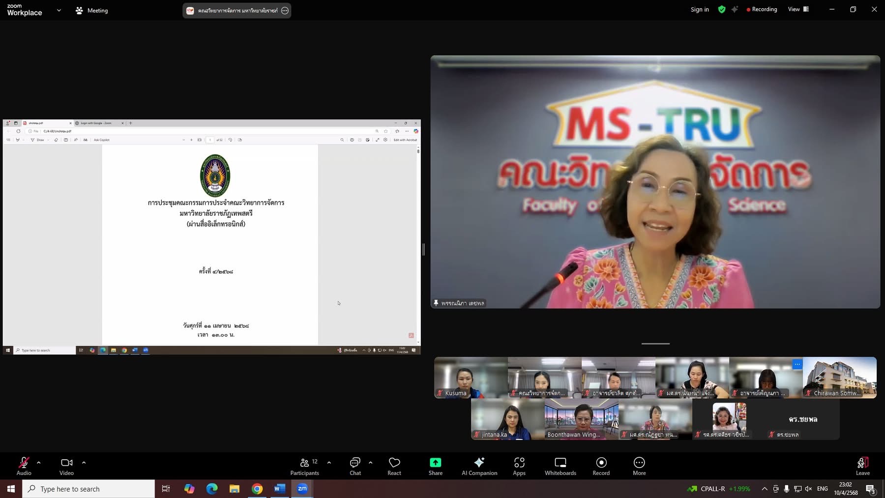 วันที่ 11 เมษายน 2568 ผศ.พรรณนิภา เดชพล คณบดีคณะวิทยาการจัดการ เป็นประธานการประชุมคณะกรรมการประจำคณะวิทยาการจัดการ ครั้งที่ 4/2568 ในรูปแบบการประชุมระบบ Hybrid Meeting ณ ห้องช่อยูงทอง ชั้น 2 อาคาร 22 คณะวิทยาการจัดการ ซึ่งมีคณะกรรมการเข้าร่วมการประชุมกว่า 2 ใน 3 ซึ่งมีคณะกรรมการเข้าร่วมการประชุมกว่า 2 ใน 3 โดยมีวาระสำคัญที่ร่วมกันพิจารณา ได้แก่ การพิจารณากำหนดตำแหน่งทางวิชาการ ระดับผู้ช่วยศาสตราจารย์ จำนวน 1 ราย/การพิจารณาผู้สอนนักศึกษาภาคพิเศษ ภาคการศึกษาฤดูร้อน ปีการศึกษา 2567/การพิจารณาผู้สอนนักศึกษาภาคปกติ ภาคการศึกษาที่ 1 ปีการศึกษา 2568/การพิจารณาขอเปลี่ยนแปลงผลการเรียน ร (I), ขาดสอบ (M) นักศึกษาภาคปกติ และภาคพิเศษ/การพิจารณาการขอแก้ไขผลการเรียนนักศึกษาภาคพิเศษ/การพิจารณาสรุปจำนวนผู้สำเร็จการศึกษาเพื่อเสนอสภาวิชาการ/การพิจารณาการเทียบโอนผลการเรียนนักศึกษาภาคพิเศษ/การพิจารณาคำร้องขอมีสิทธิสอบปลายภาค นักศึกษาภาคปกติ/การพิจารณาการเสนอแผนการพัฒนาหลักสูตรใหม่ – แผนการปรับปรุงหลักสูตร ปีการศึกษา 2569 – 2573