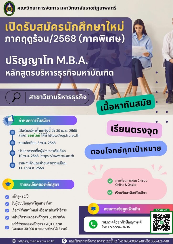 หลักสูตรบริหารธุรกิจมหาบัณฑิต (MBA) มหาวิทยาลัยราชภัฏเทพสตรี ลพบุรี เปิดรับแล้ว ถึงวันที่ 30 เมษายน 2568