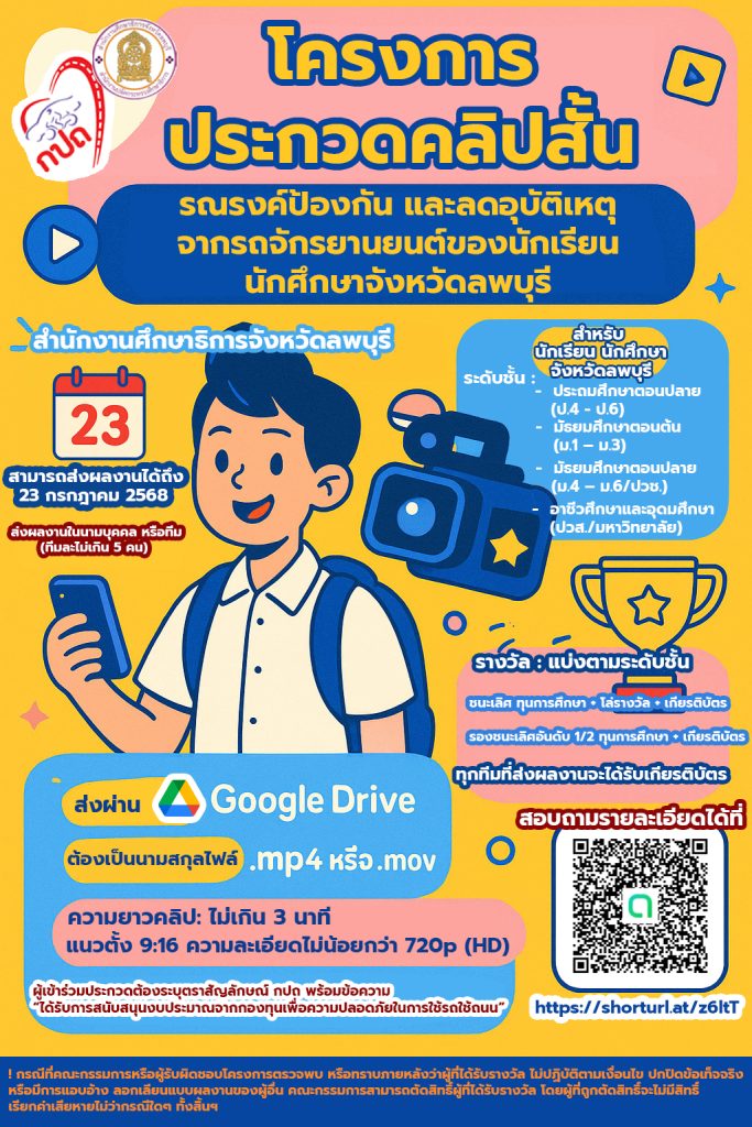 ด้วยสำนักงานศึกษาธิการจังหวัดลพบุรี ได้จัดกิจกรรมการแข่งขันประกวดคลิปสั้น รณรงค์ป้องกันและลดอุบัติเหตุ สำหรับนักเรียนนักศึกษา จึงขออนุญาตประชาสัมพันธ์ และขอความอนุเคราะห์ทุกท่านช่วยประชาสัมพันธ์ให้หน่วยงาน และสถานศึกษาทราบ