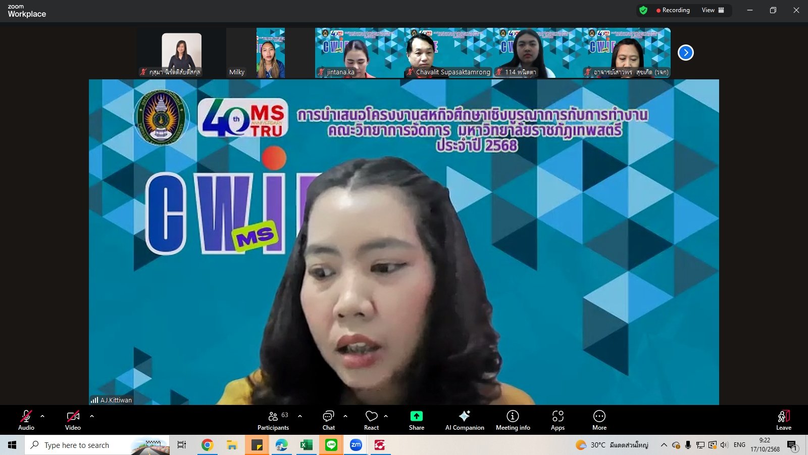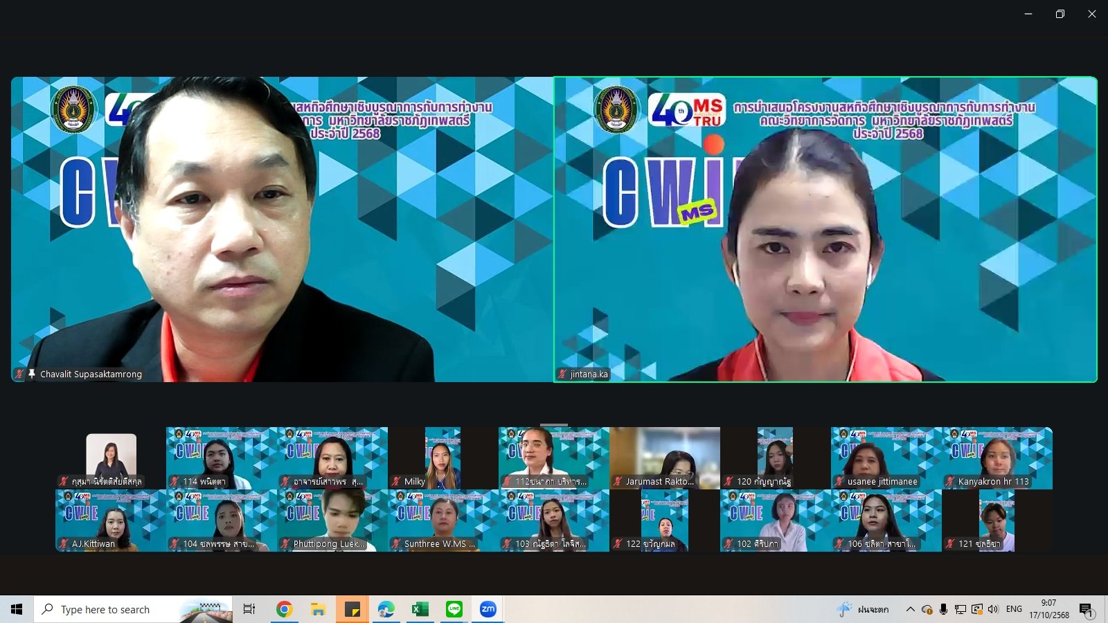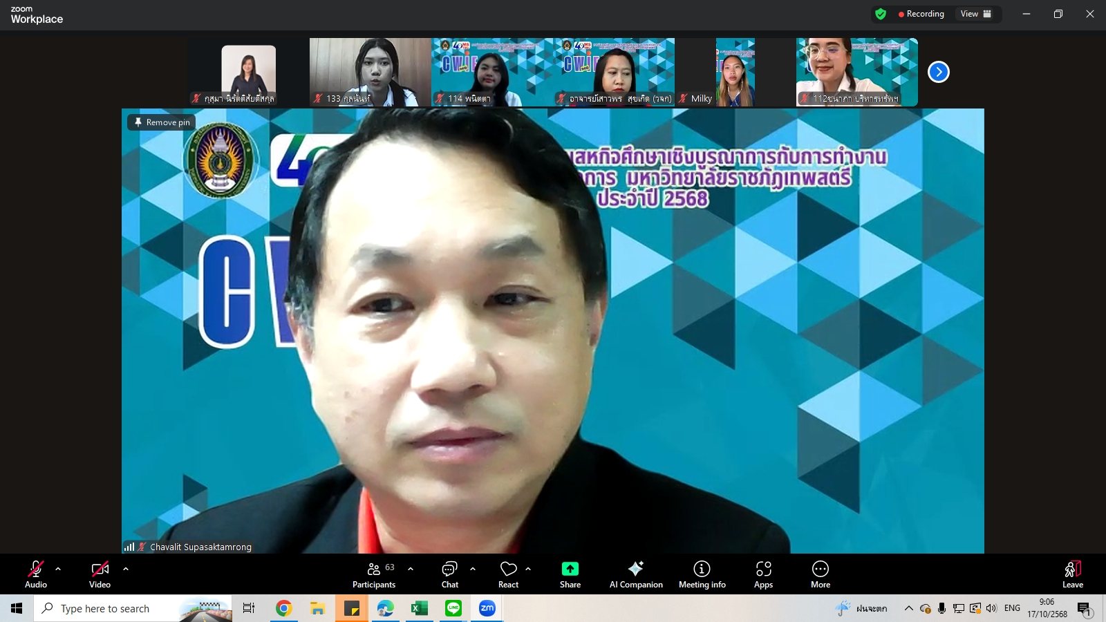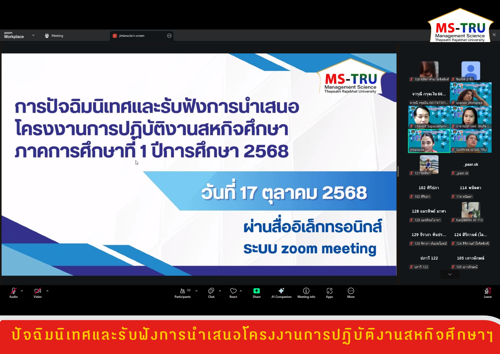 วันที่ 17 ตุลาคม 2568 อ.ชวลิต ศุภศักดิ์ธำรง รองคณบดีฝ่ายวิชาการและประกันคุณภาพการศึกษา คณะวิทยาการจัดการ เป็นประธานเปิดโครงการปัจฉิมนิเทศและรับฟังการนำเสนอโครงงานการปฏิบัติงานสหกิจศึกษา ภาคการศึกษาที่ 1 ปีการศึกษา 2568 ในรูปแบบผ่านสื่ออิเล็กทรอนิกส์ Zoom Meeting ให้แก่ นักศึกษาออกปฏิบัติงานสหกิจศึกษา สาขาบริหารธุรกิจ วิชาเอกการจัดการ วิชาเอกการบริหารทรัพยากรมนุษย์และองค์การ และสาขาวิชาการจัดการโลจิสติกส์ จำนวน 38 คน มีวัตถุประสงค์เพื่อให้นักศึกษาได้นำเสนอโครงงานการปฏิบัติงานสหกิจศึกษา แลกเปลี่ยนความรู้ สะท้อนปัญหาที่ได้รับจากการปฏิบัติงานสหกิจศึกษา