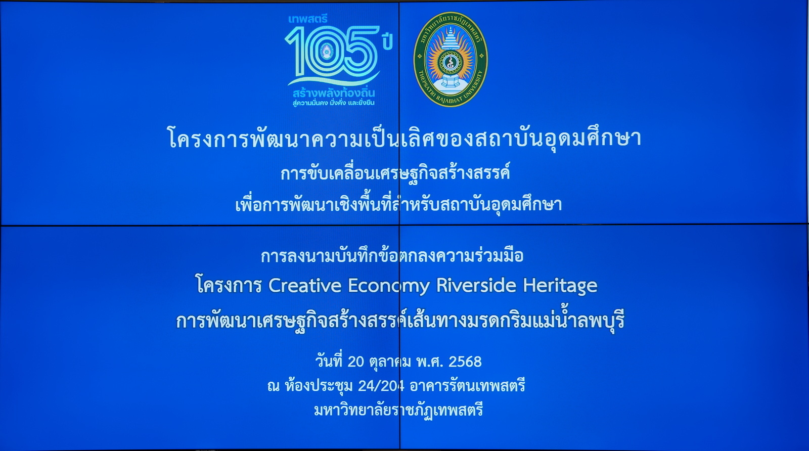 วันที่ 20 ตุลาคม พ.ศ. 2568ผศ.พรรณนิภา เดชพล คณบดีคณะวิทยาการจัดการเข้าร่วมโครงการพัฒนาความเป็นเลิศของสถาบันอุดมศึกษา การขับเคลื่อนเศรษฐกิจสร้างสรรค์ เพื่อการพัฒนาเชิงพื้นที่สำหรับสถาบันอุดมศึกษา และการลงนามบันทึกข้อตกลงความร่วมมือโครงการ Creative Economy Riverside Heritage : การพัฒนาเศรษฐกิจสร้างสรรค์เส้นทางมรดกริมแม่น้ำลพบุรี โดยมี ผศ.ดร.กันยา บาร์นท์ อธิการบดีมหาวิทยาลัยราชภัฏเทพสตรี เป็นประธานเปิดโครงการ ซึ่งเป็นกิจกรรมภายใต้แผนงานพัฒนาความเป็นเลิศของสถาบันอุดมศึกษาและการพัฒนากำลังคนขั้นสูง (Reinventing University) ซึ่งจัดโดยคณะกรรมการดำเนินโครงการ Creative Economy Riverside Heritage : การพัฒนาเศรษฐกิจสร้างสรรค์เส้นทางมรดกริมน้ำ สำหรับกิจกรรมนี้มีภาคีเครือข่าย ทั้งหน่วยงานภาครัฐ ภาคเอกชน และภาคประชาสังคม เข้าร่วมกิจกรรมกว่า 50 คน โดยภายหลังเสร็จสิ้นกิจกรรมผู้เข้าร่วมกิจกรรมจะได้ร่วมกันแลกเปลี่ยนความคิดเห็นในการพัฒนาพื้นที่มรดกริมแม่น้ำ นอกจากนี้ยังเกิดการสร้างต้นแบบของการพัฒนาที่สมดุลระหว่างการอนุรักษ์มรดกทางวัฒนธรรมและการสร้างความเจริญทางเศรษฐกิจ โดยโครงการดังกล่าว ประกอบด้วย 2 โครงการย่อยที่ดำเนินงานแบบคู่ขนานและส่งเสริมซึ่งกันและกัน ได้แก่ โครงการ Smart Heritage Makers ที่มุ่งเน้นการพัฒนากำลังคนผ่านกระบวนการสำรวจและวิเคราะห์ช่องว่างทางทักษะ นำไปสู่การพัฒนาหลักสูตรระยะสั้นที่ตอบโจทย์ความต้องการของชุมชน เช่น หลักสูตรทัคคุเทศก์ชุมชน และหลักสูตรผู้ประกอบการริมน้ำ และโครงการ Vreative Riverside Economy ที่มุ่งเน้นการพัฒนาพื้นที่และระบบนิเวศทางธุรกิจ ผ่านการออกแบบพื้นสร้างสรรค์ร่วมกับชุมชน การพัฒนาผลิตภัณฑ์อัตลักษณ์ และการส่งเสริมการตลาดด้วยแพลตฟอร์มดิจิทัลและกิจกรรมสร้างสรรค์ ณ ห้องประชุม 24/204 ชั้น 2 อาคารรัตนเทพสตรี