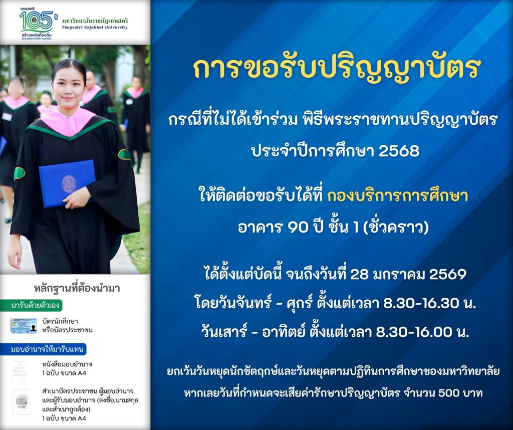 กรณีที่ไม่ได้เข้าร่วมพิธีพระราชทานปริญญาบัตร ประจำปีการศึกษา 2568