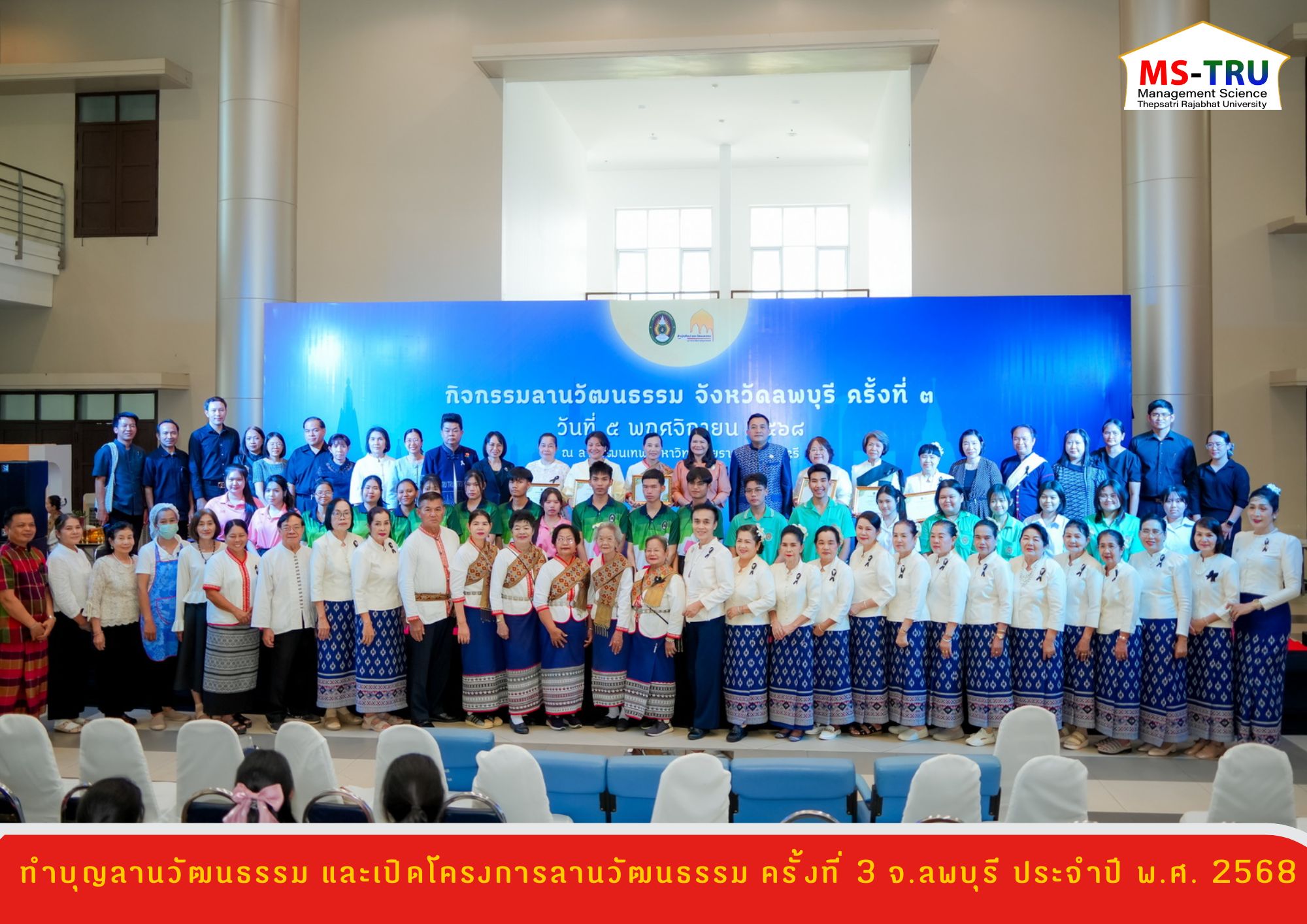 วันที่ 5 พฤศจิกายน 2568 อ.เสาวพร สุขเกิด รองคณบดีฝ่ายกิจการนักศึกษาและพันธกิจสัมพันธ์ คณะวิทยาการจัดการ พร้อมด้วยคณาจารย์ บุคลากร และนักศึกษา คณะวิทยาการจัดการ เข้าร่วมโครงการลานวัฒนธรรม จังหวัดลพบุรี ครั้งที่ 3 ประจำปี พ.ศ. 2568 จัดโดยสำนักศิลปะและวัฒนธรรม มีวัตถุประสงค์เพื่อให้ตระหนักถึงความสำคัญของการอนุรักษ์ ฟื้นฟู และเผยแพร่ศิลปวัฒนธรรมอันดีงามของท้องถิ่น เกิดการสืบสานภูมิปัญญาและอัตลักษณ์ทางวัฒนธรรม ได้เรียนรู้วิถีชิวิต ประเพณี วัฒนธรรม และอาหารท้องถิ่นของกลุ่มชาติพันธุ์และชุมชนท้องถิ่น อาทิ กลุ่มวัฒนธรรมไทพวนบ้านน้ำจั้น, กลุ่มวัฒนธรรมไทพวนบ้านถนนใหญ่, กลุ่มอาหารไทยพื้นถิ่น, วิสาหกิจชุมชนหนองกระเบียนโมเดล, กลุ่มวัฒนธรรมลาวเวียงบ้านหนองแขม และกลุ่มวัฒนธรรมไทยวน นอกจากนี้ยังได้ร่วมประดิษฐ์กระทงจากวัสดุธรรมชาติ การทำโคมยี่เป็ง และการแลกเปลี่ยนเรียนรู้ด้านวัฒนธรรม โดยมี ผศ.ดร.กันยา บาร์นท์ อธิการบดีมหาวิทยาลัยราชภัฏเทพสตรี เป็นประธานในพิธี ณ ห้องโถง ชั้น 1 อาคารรัตนเทพสตี มหาวิทยาลัยราชภัฏเทพสตรี
