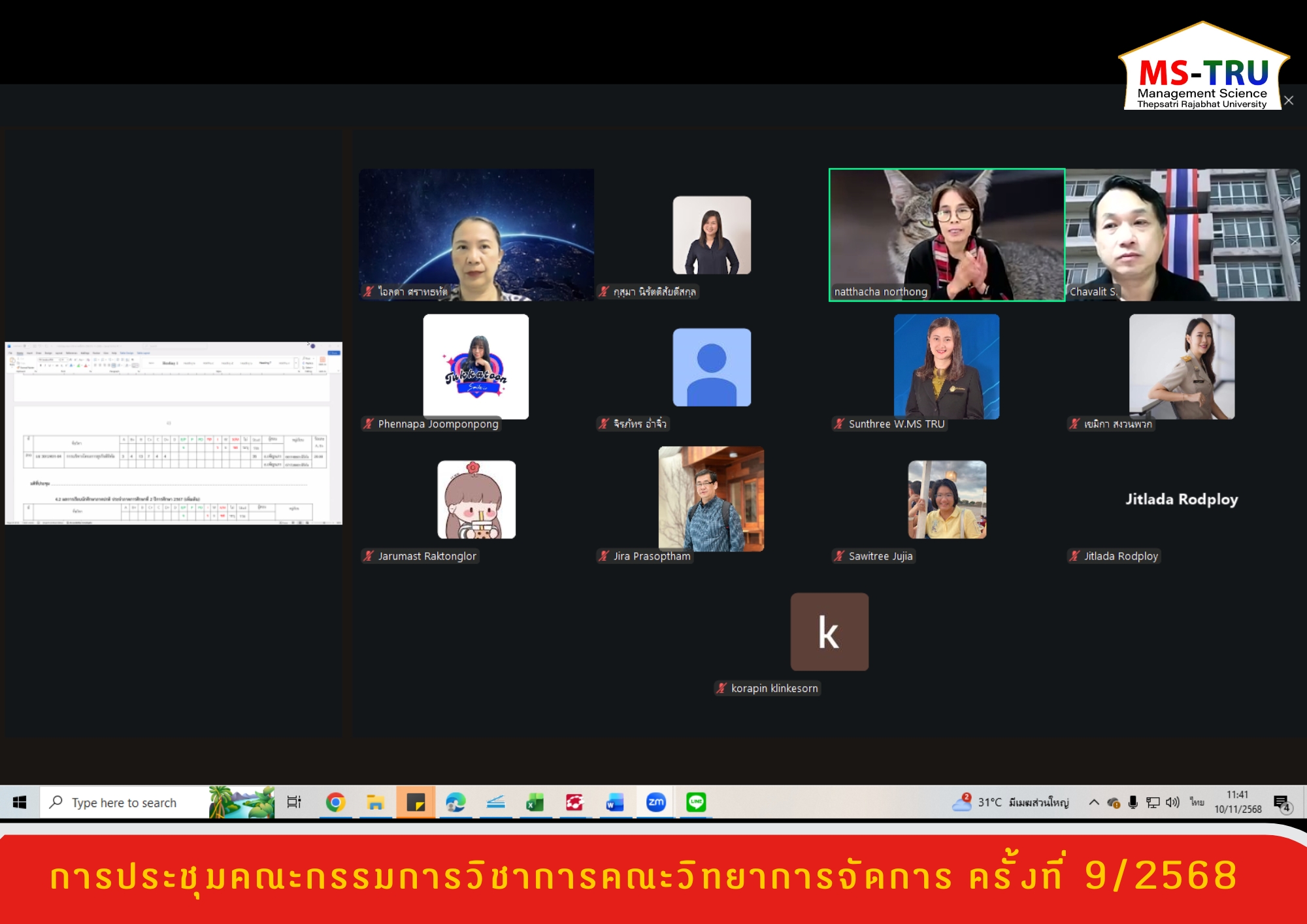 วันที่ 10 พฤศจิกายน 2568 อ.ชวลิต ศุภศักดิ์ธำรง รองคณบดีฝ่ายวิชาการและประกันคุณภาพการศึกษา คณะวิทยาการจัดการ เป็นประธานการประชุมคณะกรรมการวิชาการคณะวิทยาการจัดการ ครั้งที่ 9/2568 ในรูปแบบการประชุมผ่านสื่ออิเล็กทรอนิกส์ Zoom Meeting ซึ่งมีคณะกรรมการเข้าร่วม2ใน3 โดยมีวาระสำคัญที่ร่วมกันพิจารณา เรื่องเสนอเพื่อปรึกษาหารือและเพื่อพิจารณา ผลการเรียนนักศึกษาภาคปกติ ประจำภาคการศึกษาที่ 1 ปีการศึกษา 2568/ผลการเรียนนักศึกษาภาคปกติ ประจำภาคการศึกษาที่ 2 ปีการศึกษา 2567/เกรดแก้ I ของนักศึกษาภาคปกติ/เกรดแก้ M ของนักศึกษาภาคปกติ/เกรดแก้ I ของนักศึกษาภาคพิเศษ/เกรดแก้ M ของนักศึกษาภาคพิเศษ/ผู้สอนนักศึกษาภาคพิเศษ (กศ.บป.) ประจำภาคการศึกษาที่ 2 ปีการศึกษา 2568/การเทียบโอนผลการเรียนนักศึกษาภาคปกติ ภาคการศึกษาที่ 1 ปีการศึกษา 2568/การเทียบโอนผลการเรียนนักศึกษาภาคพิเศษ (กศ.บป.) ภาคการศึกษาที่ 1 ปีการศึกษา 2568/ขอแก้ไขผลการเรียนภาคพิเศษ ภาคการศึกษาที่ 3 ปีการศึกษา 2567/คำร้องขอมีสิทธิ์สอบปลายภาคนักศึกษาภาคปกติ ประจำภาคการศึกษาที่ 1 ปีการศึกษา 2568