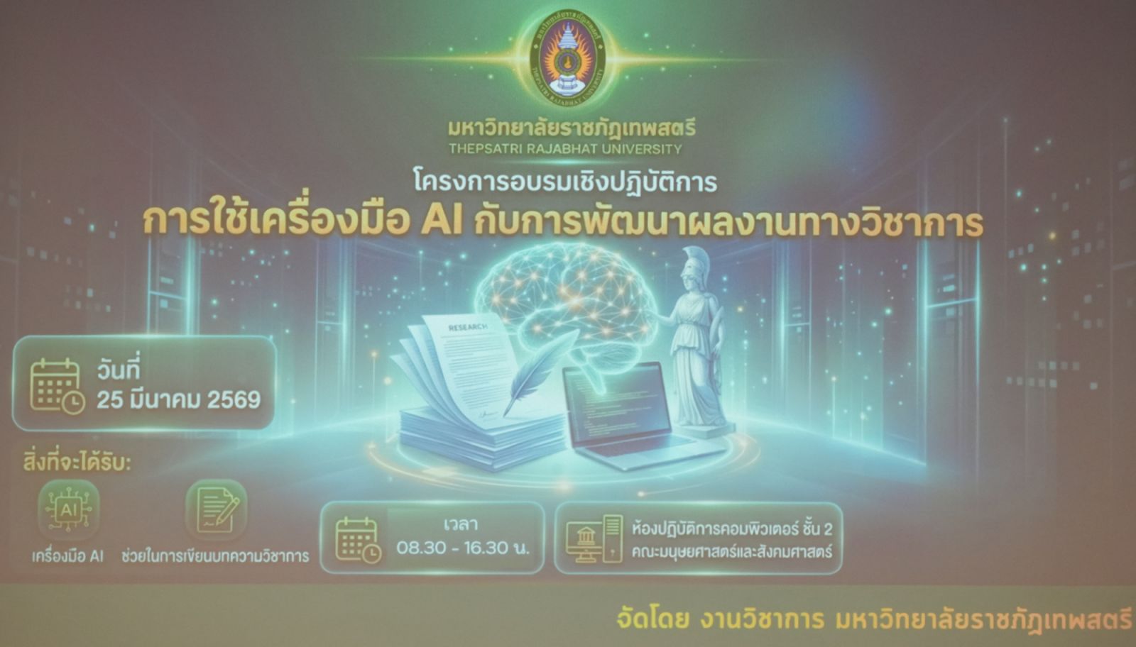 มรภ.เทพสตรี จัดอบรมการใช้เครื่องมือ AI กับการพัฒนาผลงานทางวิชาการ มุ่งยกระดับคณาจารย์สู่การจัดการศึกษาเพื่อพัฒนาท้องถิ่นที่ยั่งยืน