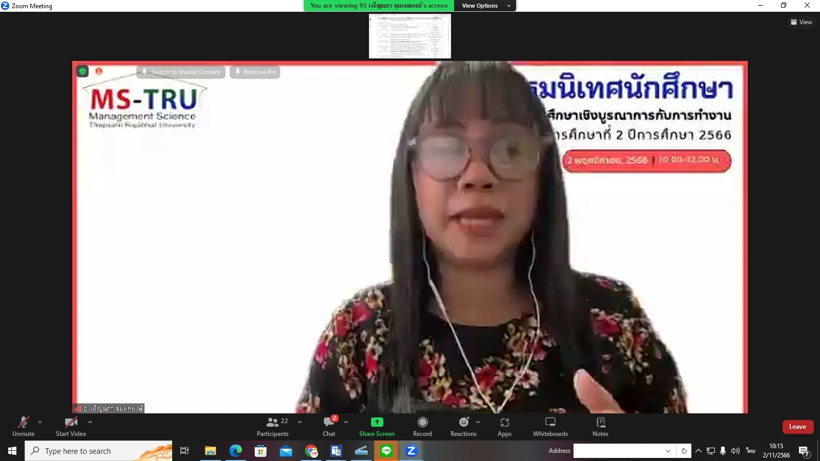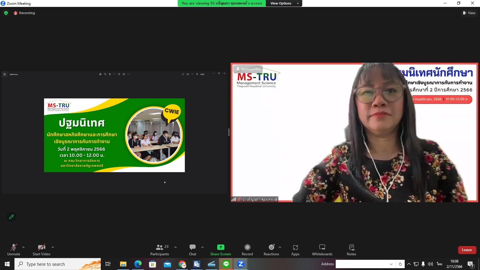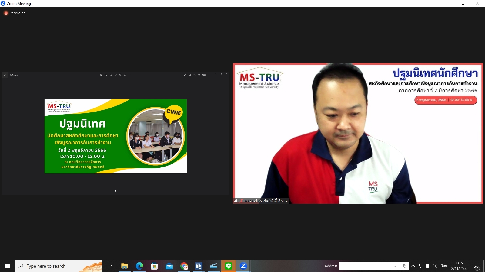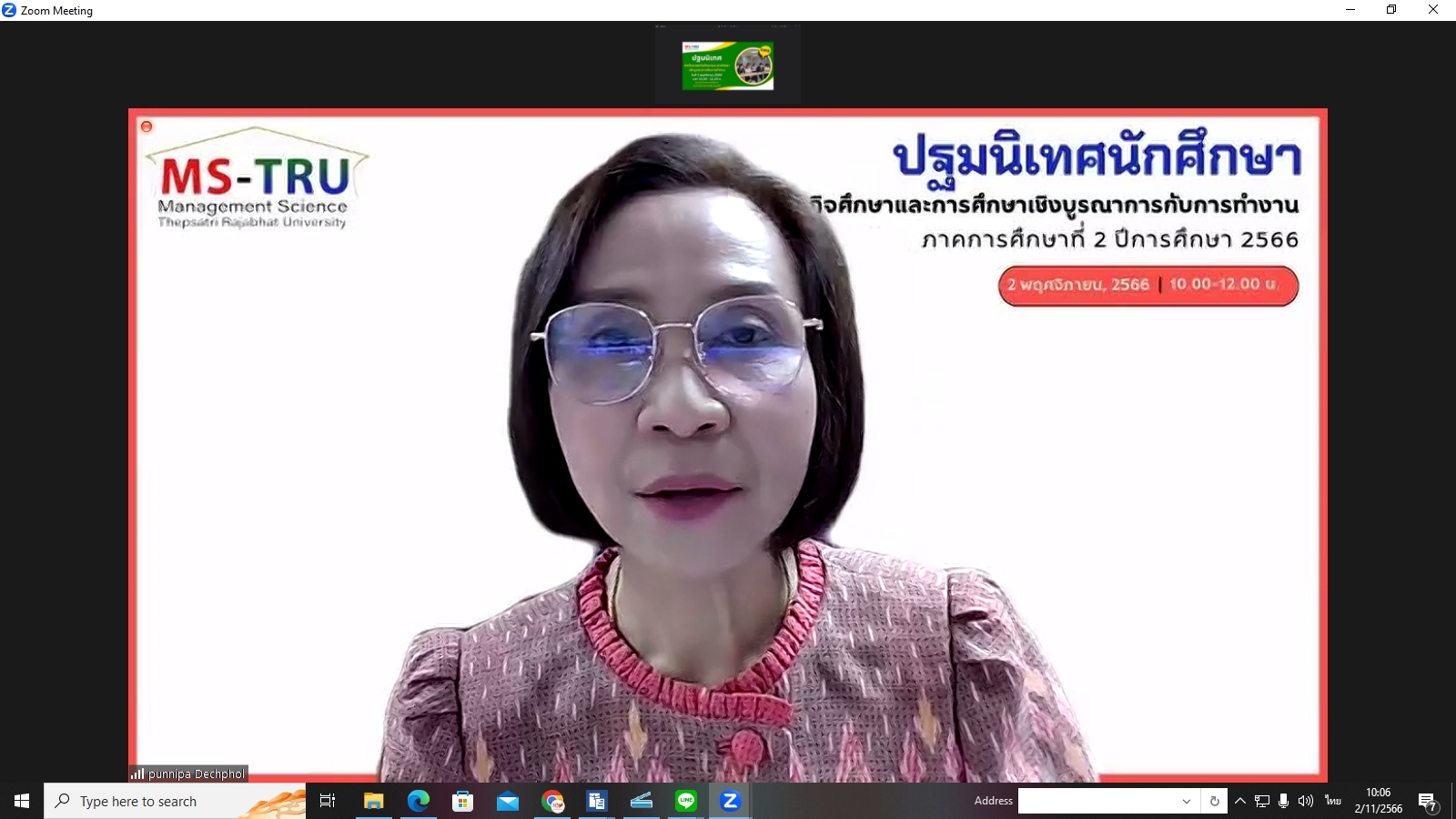 วันที่ 2 พฤศจิกายน พ.ศ. 2566 ผศ.พรรณนิภา เดชพล คณบดีคณะวิทยาการจัดการ เป็นประธานในพิธีเปิดการปฐมนิเทศนักศึกษาสหกิจศึกษาและการศึกษาเชิงบูรณาการกับการทำงาน ภาคการศึกษาที่ 2 ปีการศึกษา 2566 วันที่ 2 พฤศจิกายน 2566 พร้อมด้วยรองคณบดีฝ่ายบริหาร รองคณบดีฝ่ายกิจการนักศึกษา และคณาจารย์คณะวิทยาการจัดการ มีวัตถุประสงค์เพื่อนักศึกษาได้รับทราบแนวทางการปฏิบัติตนในการฝึกประสบการณ์วิชาชีพที่ถูกต้อง ผ่านสื่ออิเล็คทรอนิกส์ระบบ Zoom meeting