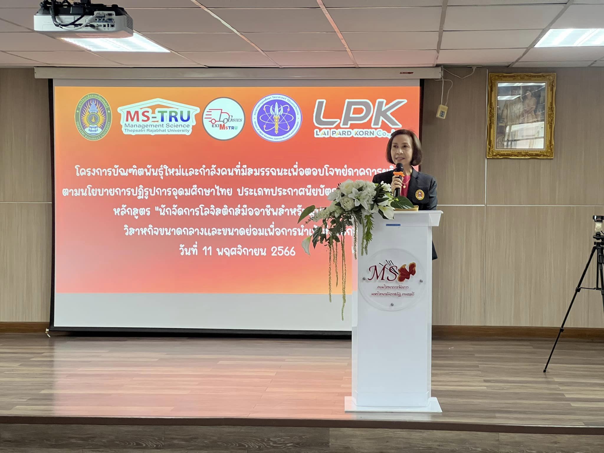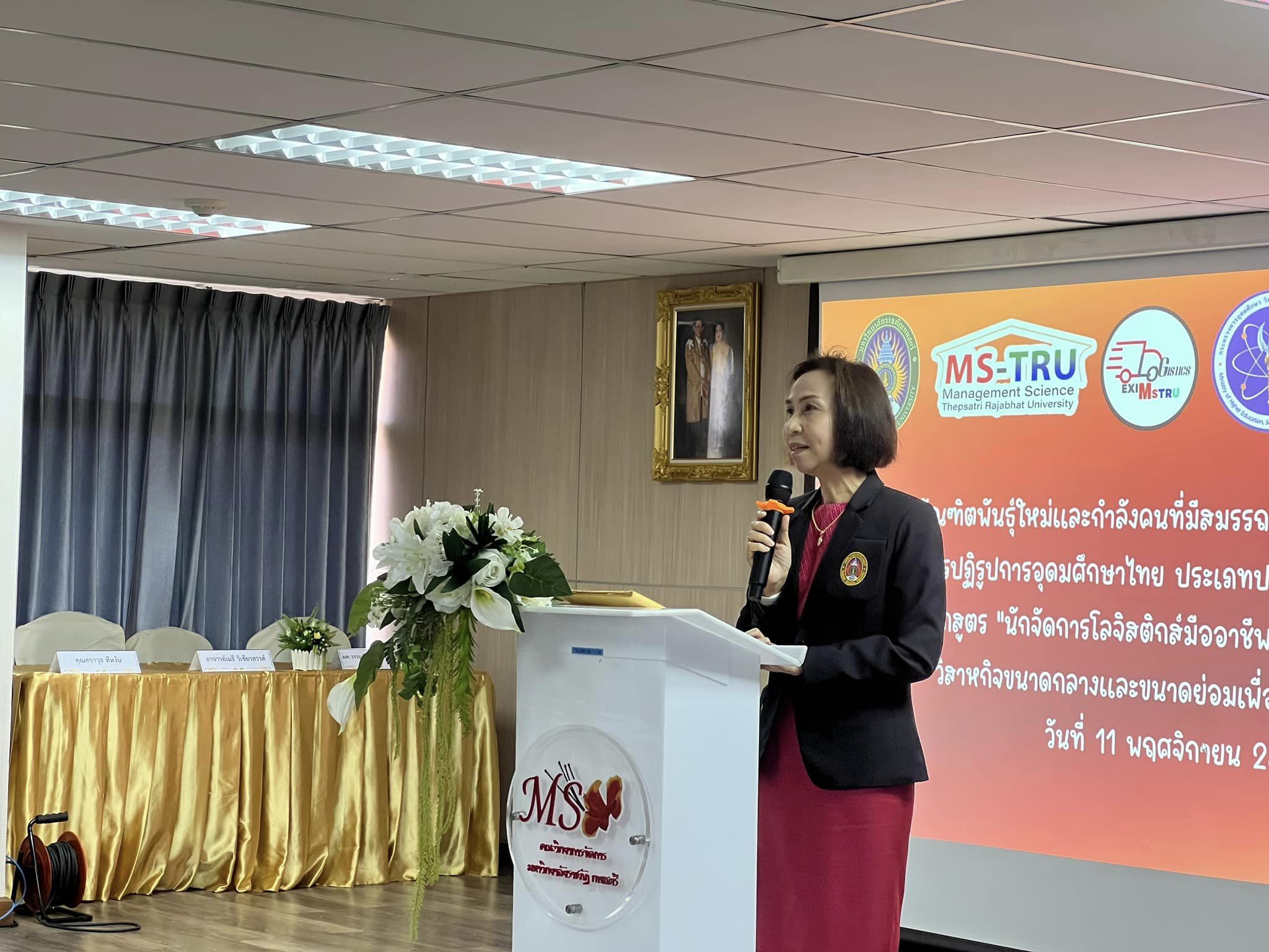 วันที่ 11 พฤศจิกายน 2566 ผศ.พรรณนิภา เดชพล คณบดีคณะวิทยาการจัดการ ให้เกียรติเป็นประธานเปิดโครงการปฐมนิเทศ โครงการบัณฑิตพันธุ์ใหม่ หลักสูตรนักการจัดการโลจิสติกส์มืออาชีพ สำหรับผู้ประกอบการวิสาหกิจชุมชนขนาดกลางและขนาดย่อมเพื่อการนำเข้าและส่งออก จัดโดยสาขาวิชาการจัดการโลจิสติกส์ คณะวิทยาการจัดการ มหาวิทยาลัยราชภัฎเทพสตรี