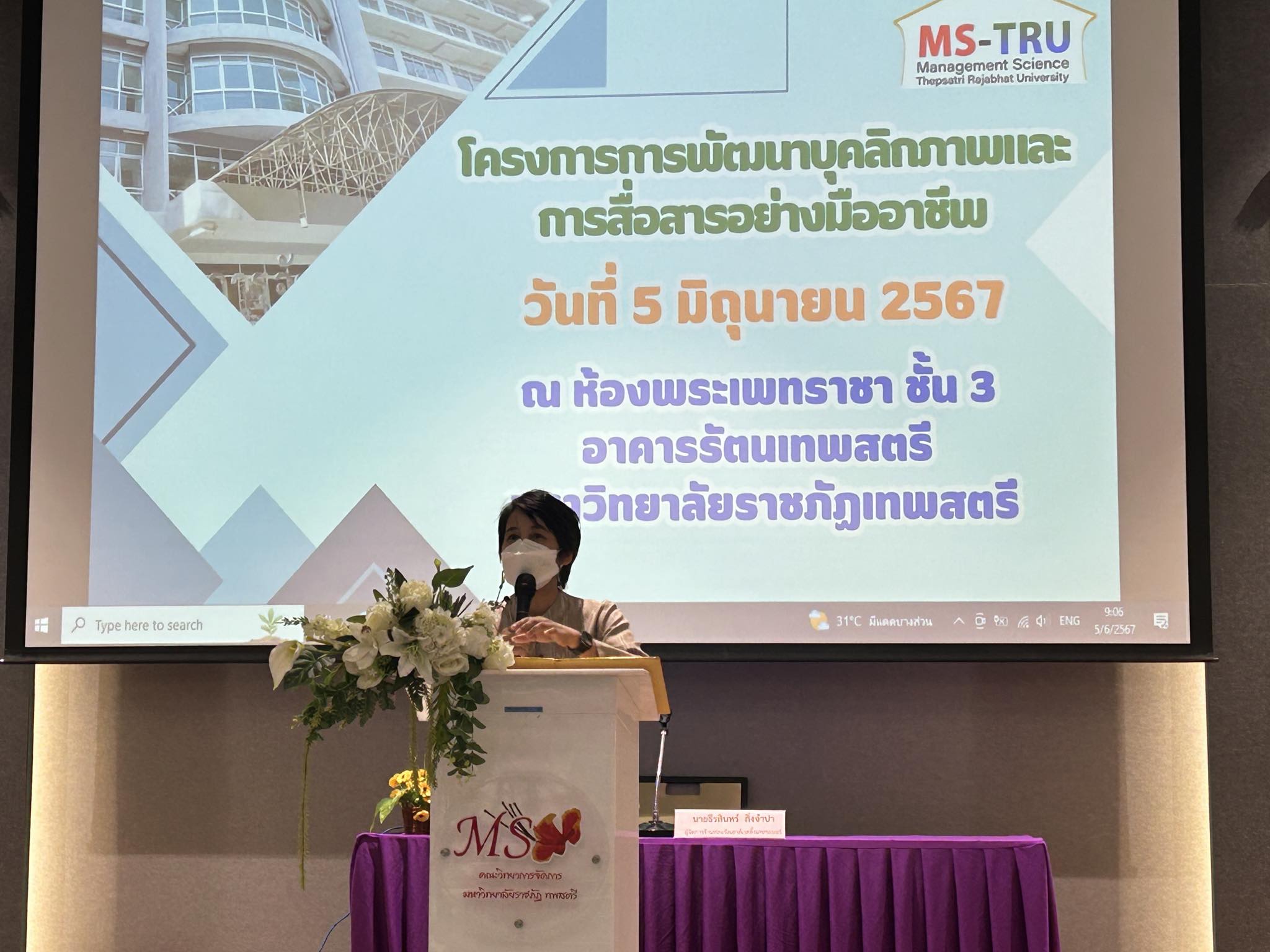 เมื่อวันที่ 5 มิถุนายน 2567 งานวิชาการ คณะวิทยาการจัดการ จัดโครงการพัฒนาทักษะและเตรียมความพร้อมของนักศึกษาก่อนออกฝึกประสบการณ์วิชาชีพภาคปกติ ภาคการศึกษาที่ 1 ปีการศึกษา 2567 ให้แก่นักศึกษาจำนวน 115 คน โดยมีวัตถุประสงค์เพื่อพัฒนาทักษะและเตรียมความพร้อมของนักศึกษาก่อนออกฝึกประสบการณ์วิชาชีพภาคปกติ ภาคการศึกษาที่ 1 ปีการศึกษา 2567 โดยมี นายธีรสินทร์ กิ่งจำปา ตำแหน่ง ผู้จัดการร้านฟลอรัลเฮาส์เวดดิ้งแพลนเนอร์ บรรยายหัวข้อ การพัฒนาบุคลิกภาพและการสื่อสารอย่างมืออาชีพ ณ ห้องประชุมพระเพทราชา ชั้น 3 อาคารรัตนเทพสตรี มหาวิทยาลัยราชภัฏเทพสตรี