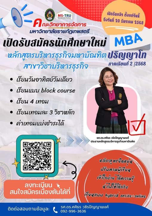 หลักสูตรบริหารธุรกิจมหาบัณฑิต (MBA) มหาวิทยาลัยราชภัฏเทพสตรี ลพบุรี ภาคเรียนที่ 2 /2568 เปิดรับแล้ว ตั้งแต่บัดนี้ ถึงวันที่ 20 ธันวาคม 2568
